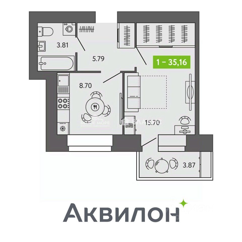 Однокомнатная квартира 35,16 м2 расположенная на 6м этаже в новом ЖК "Аквилон LISTVA"