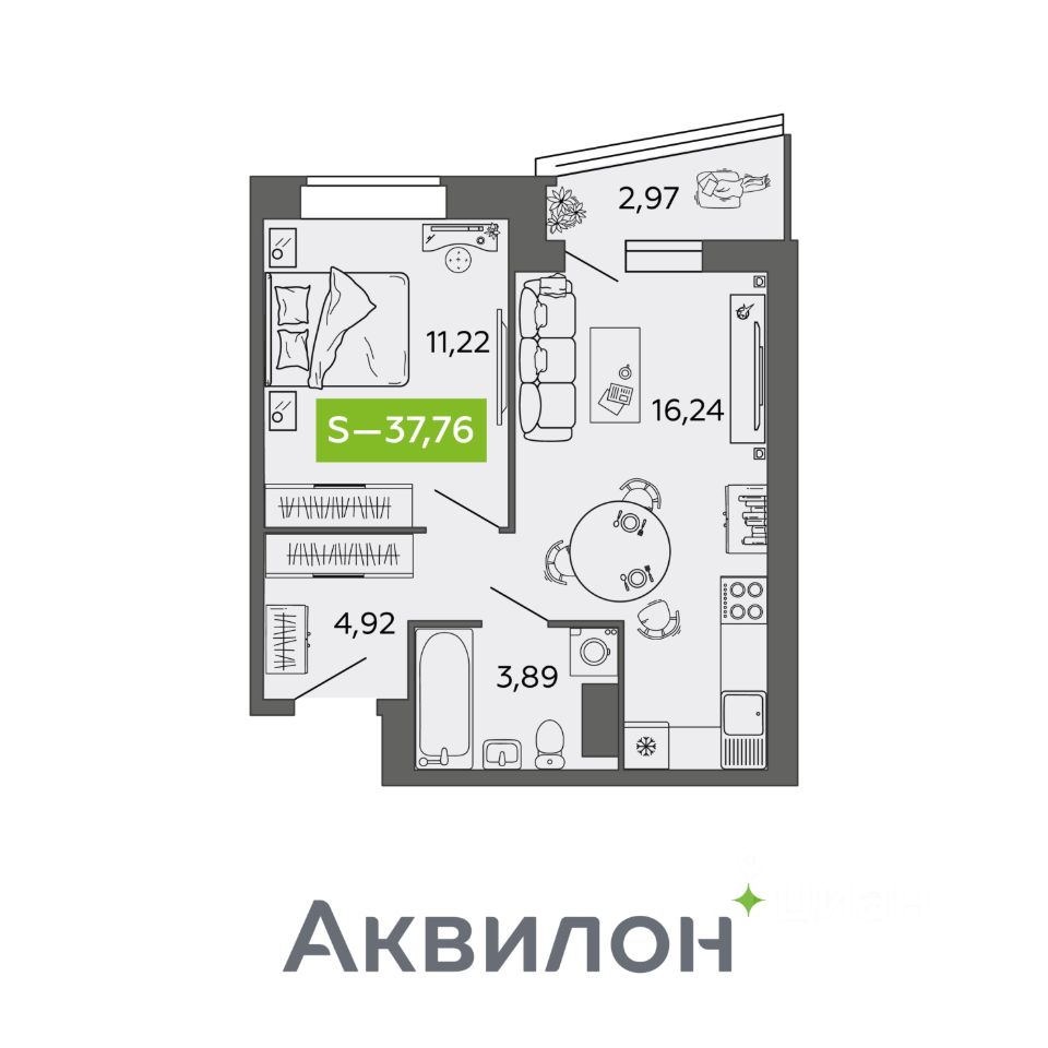 Общая площадь37,76 м²