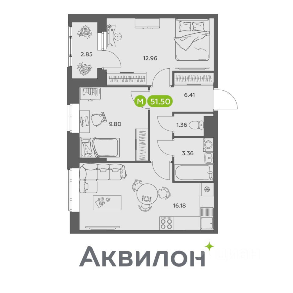 Общая площадь51,5 м²