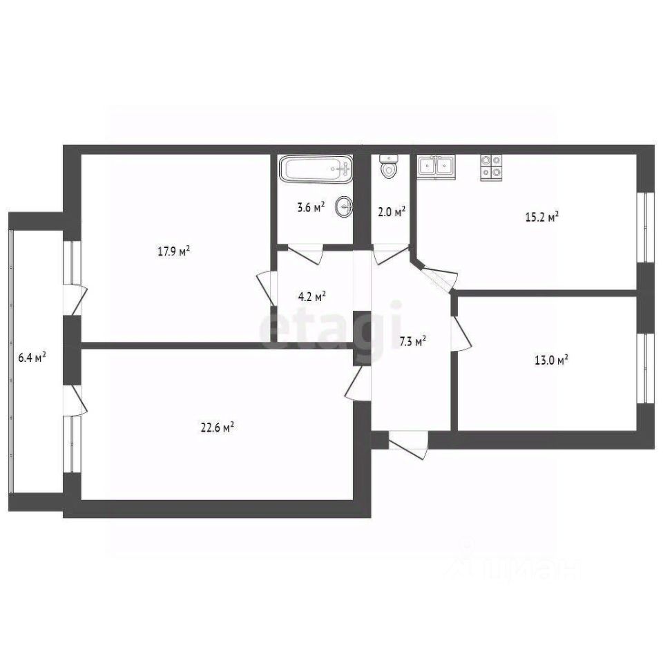 Трёхкомнатная квартира площадью 86 кв. м расположена на 6 этаже кирпичного дома в южном микрорайоне Котласа.