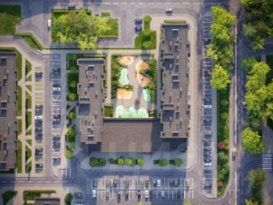 Благоустройство: разновозрастные детские площадки с антитравматическим покрытием, зона street workout: уличные тренажеры и турники, велопарковки, зоны отдыха со скамейками, озеленение территории, малые архитектурные формы.