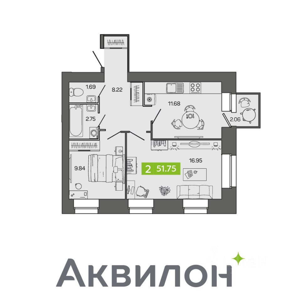 Общая площадь51,75 м²