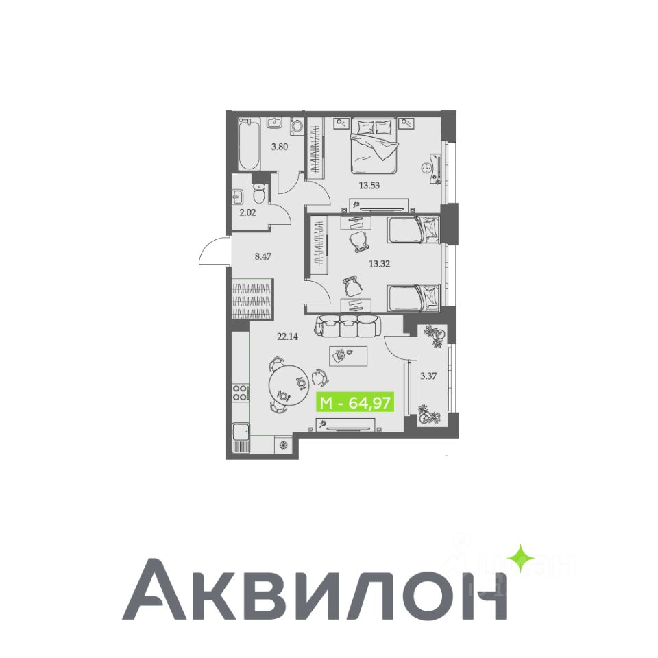 Общая площадь64,97 м²