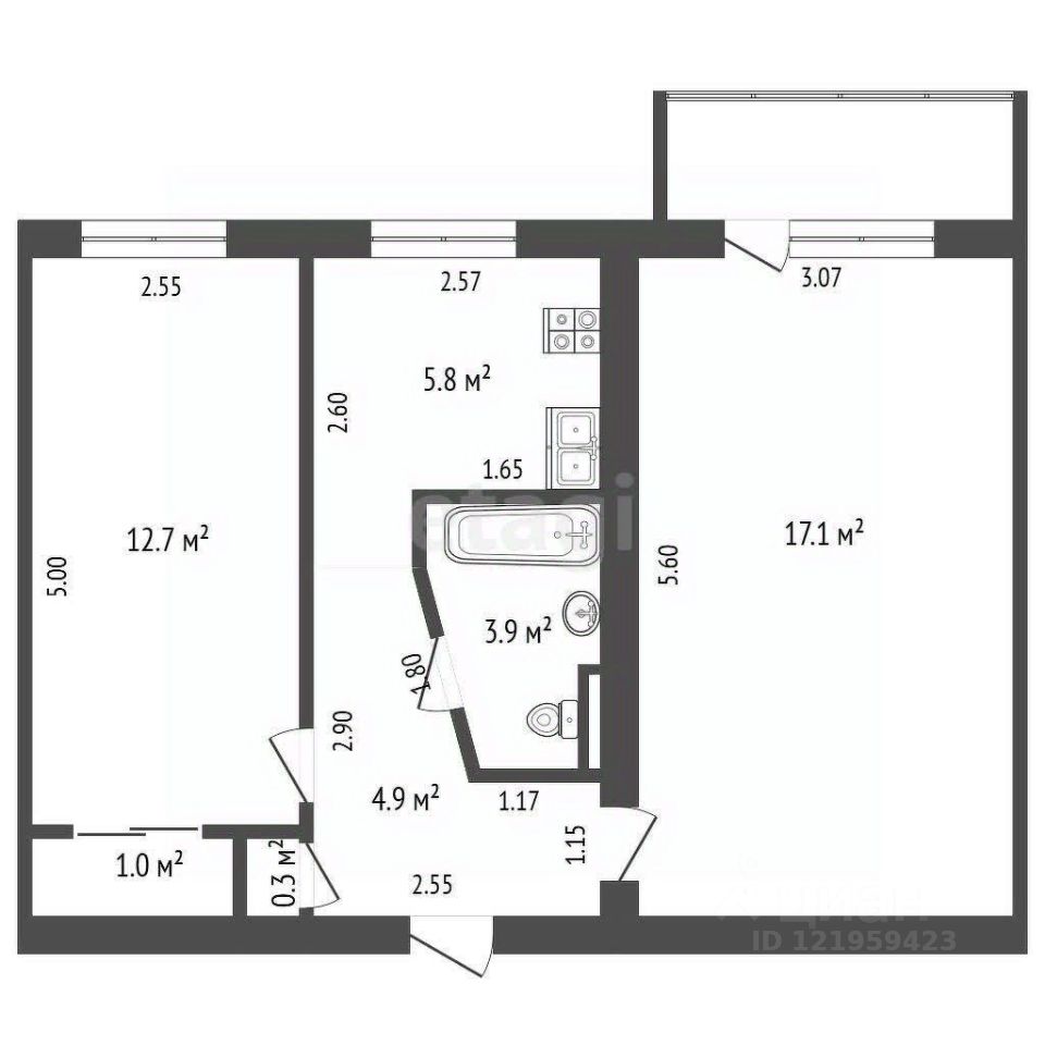 - 2 изолированные комнаты площадью 17.1 / 12.7 кв.м.
