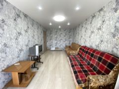 В квартире выполнен косметический ремонт: во всей квартире установлены окна ПВХ, натяжные потолки, напольное покрытие- ламинат и линолеум, новые межкомнатные двери, ванная комната- ПВХ панели, новые обои.