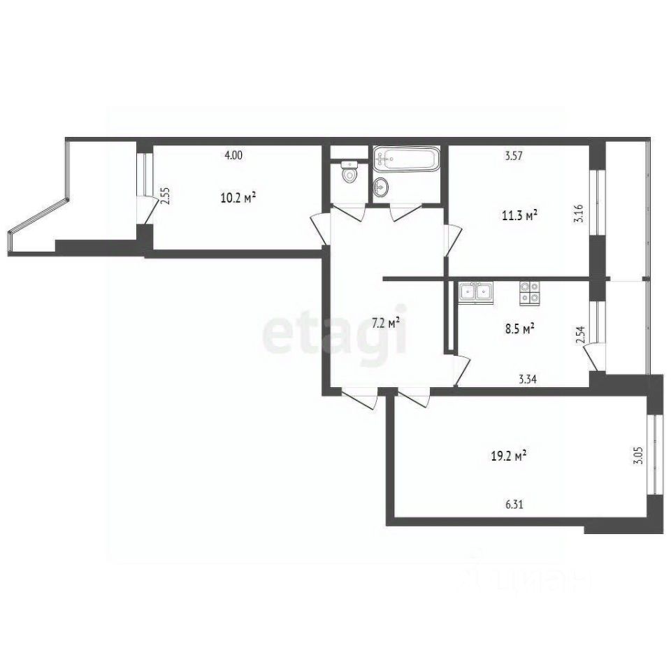 Три отдельных комнаты (19.2/11.3/10.2кв.м), 2 лоджии, просторная кухня 8,5 кв.м.