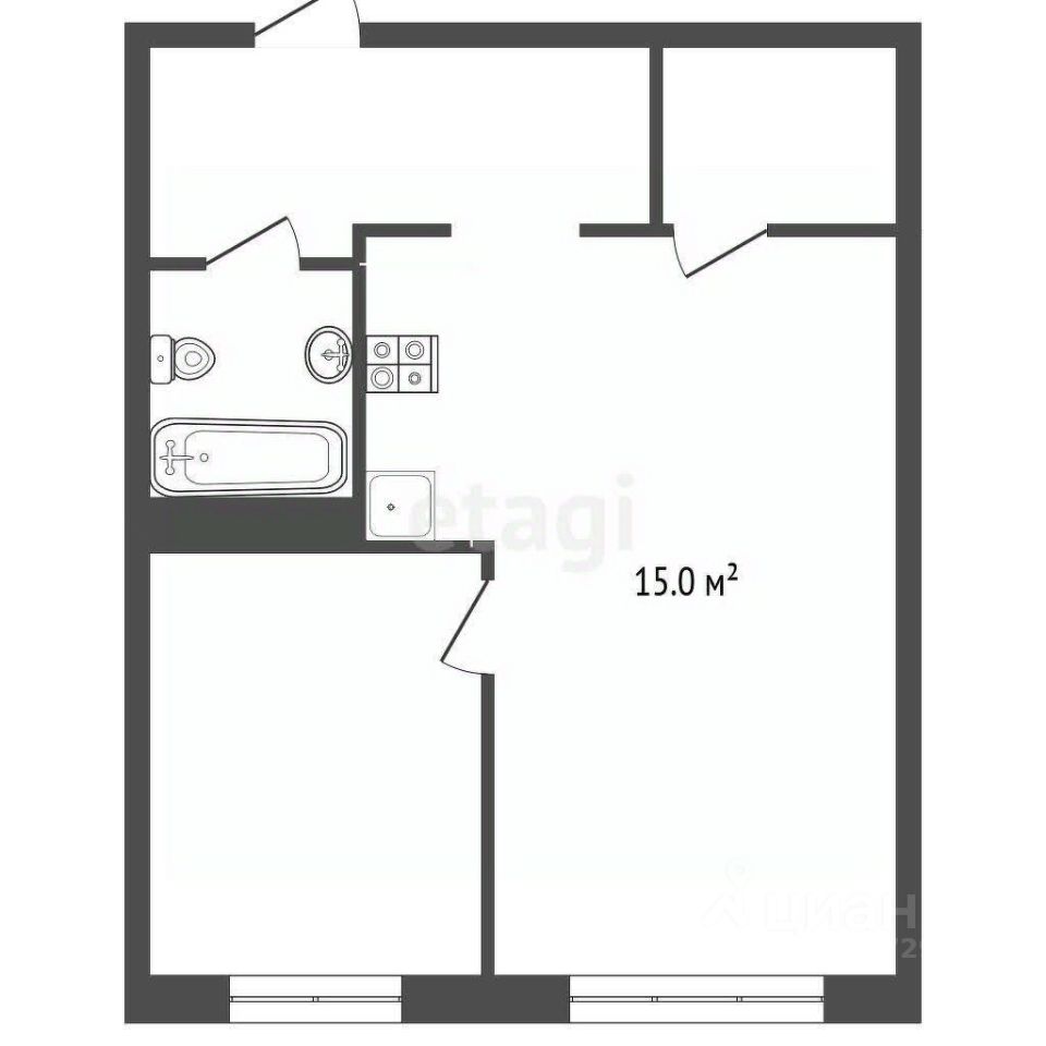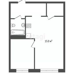 Общая площадь квартиры 40.3 м2. В квартире большая кухня-гостиная 15 м/кв. и компактная спальня или кабинет 9 м/кв., санузел совмещенный, большой балкон в два окна.