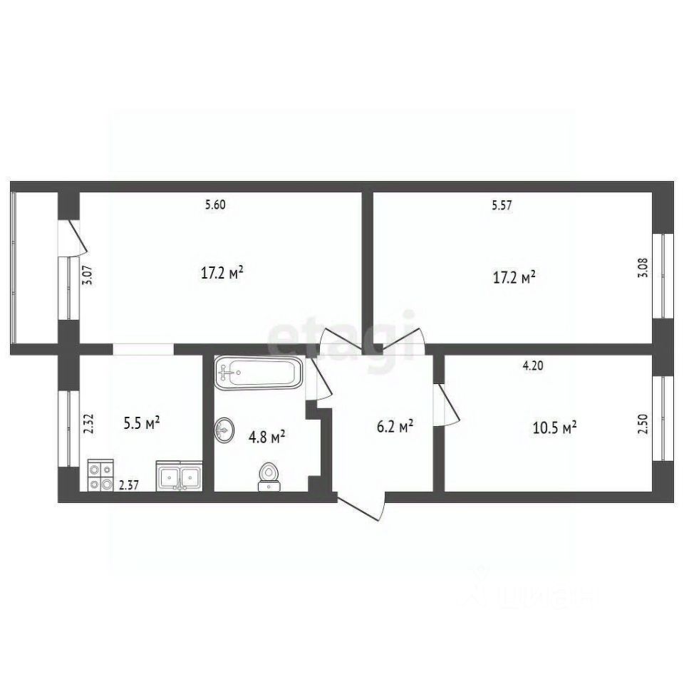 Простор и комфорт: 61 кв.м, 3 раздельные комнаты (17.2, 17.2 и 10.5 кв. м). Большая прихожая и просторная гардеробная в спальне.