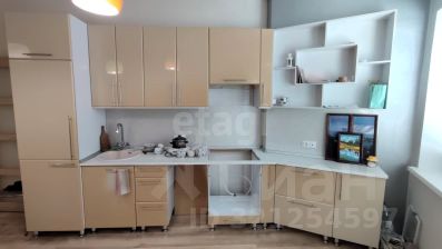 Установлен современный кухонный гарнитур угловой формы, холодильник в том же стиле — интерьер выглядит гармонично и современно.