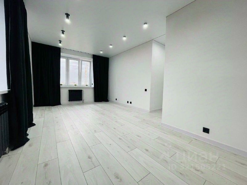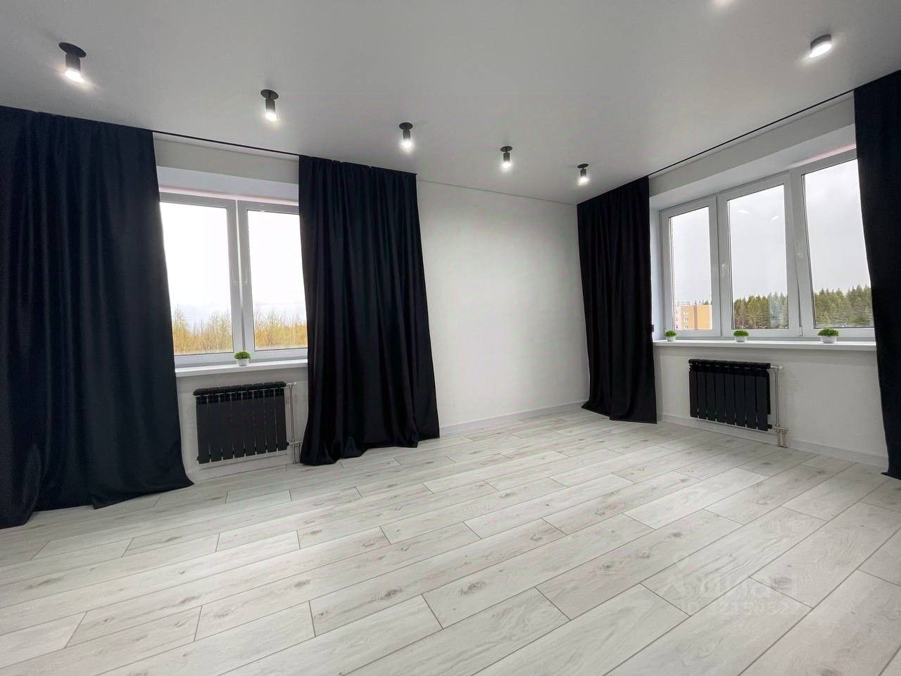 * потолки пвх на теневом профиле со встроенным освещением, черные матовые светильники, черные матовые скрытые карнизы с шторами Блэкаут,