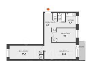 Общая площадь квартиры 58,9 кв. м.: ТРИ комнаты площадью 17,8 кв. м., 14,4 кв. м. и 9,5 кв. м., кухня 5,7 кв. м., большая прихожая;