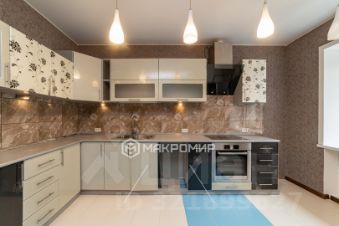 Одна из комнат оборудована в гостиную, выполнена аудиоподготовка под домашний кинотеатр. В гостиной остаётся два вертикальных шкафчика и тумба под телевизор (на фото). Кондиционер и выход на первую лоджию. Кухня с барной стойкой и индивидуальным освещением примыкает к гостиной. Кухонный гарнитур, вытяжка, духовой шкаф и варочная панель также остаются новому собственнику. В спальне есть удобный встроенный шкаф-купе для хранения личных вещей. Детская освобождена.