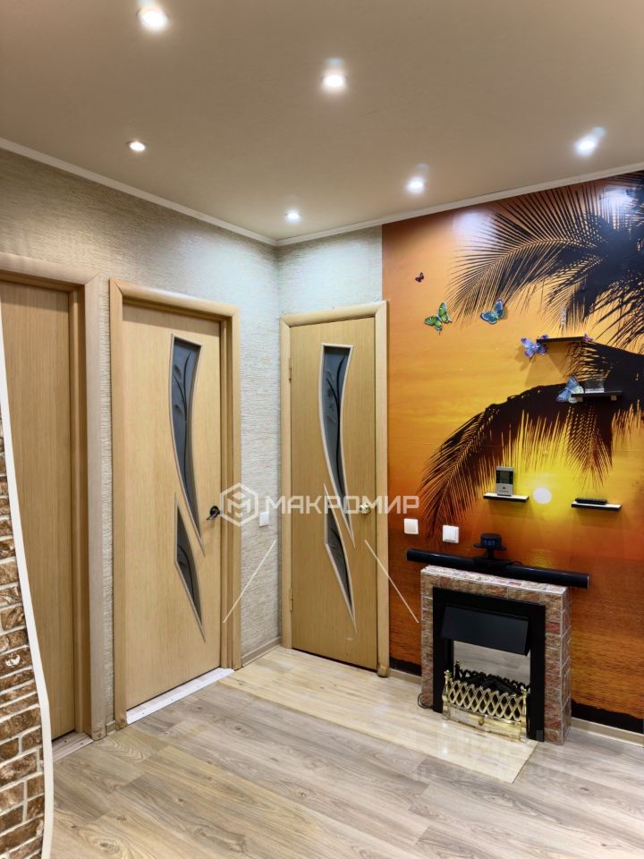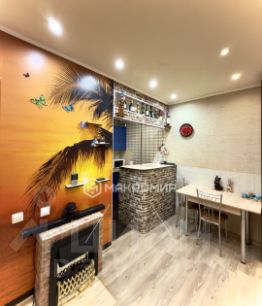 Стены оформлены в нейтральных тонах с использованием обоев с оригинальным принтом. В жилых зонах и на кухне ламинат, в ванной кафель . Освещение с использованием встроенных светильников и люстр