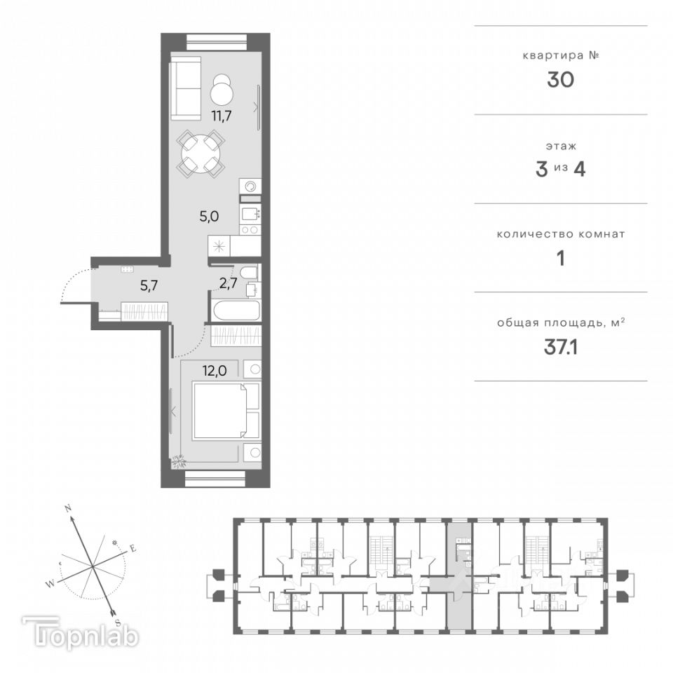 Арт. 119241055 Двусторонняя 1-но комнатная квартира площадью 37,1 кв.м.