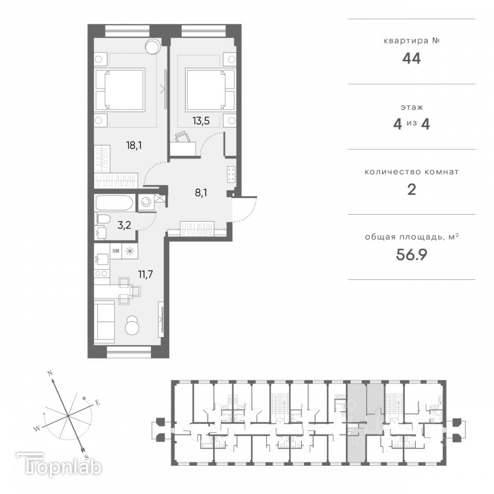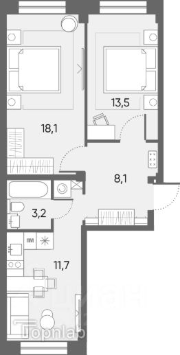 Идеальная планировка для семьи - кухня-гостиная площадью 11,7 кв.м и две спальни площадью 18,1 и 13,5 кв.м, где можно сделать просторную мастер-спальню с местами хранения и рабочим местом, и отдельную детскую комнату.