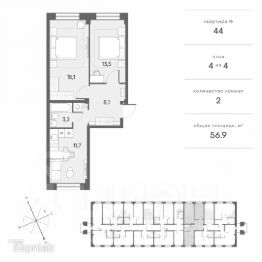 Арт. 119241105 3-х комнатная квартира с Евро-планировкой площадью 56,9 кв.м.