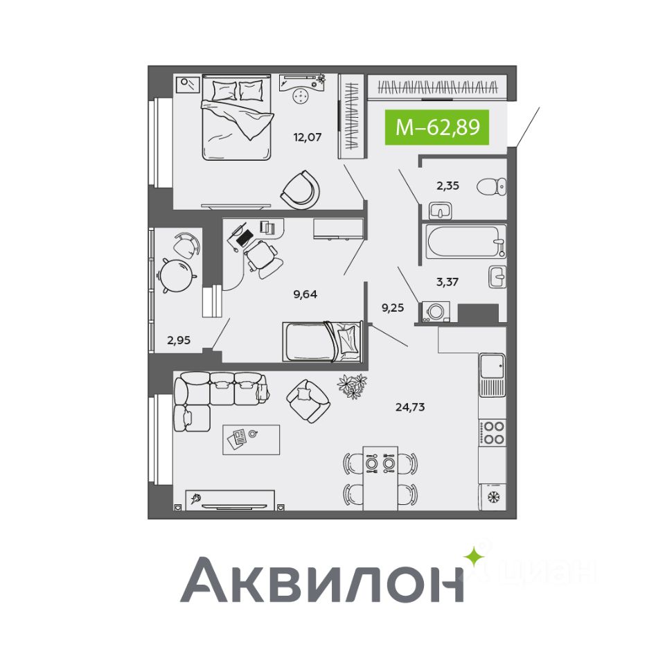 Общая площадь62,89 м²