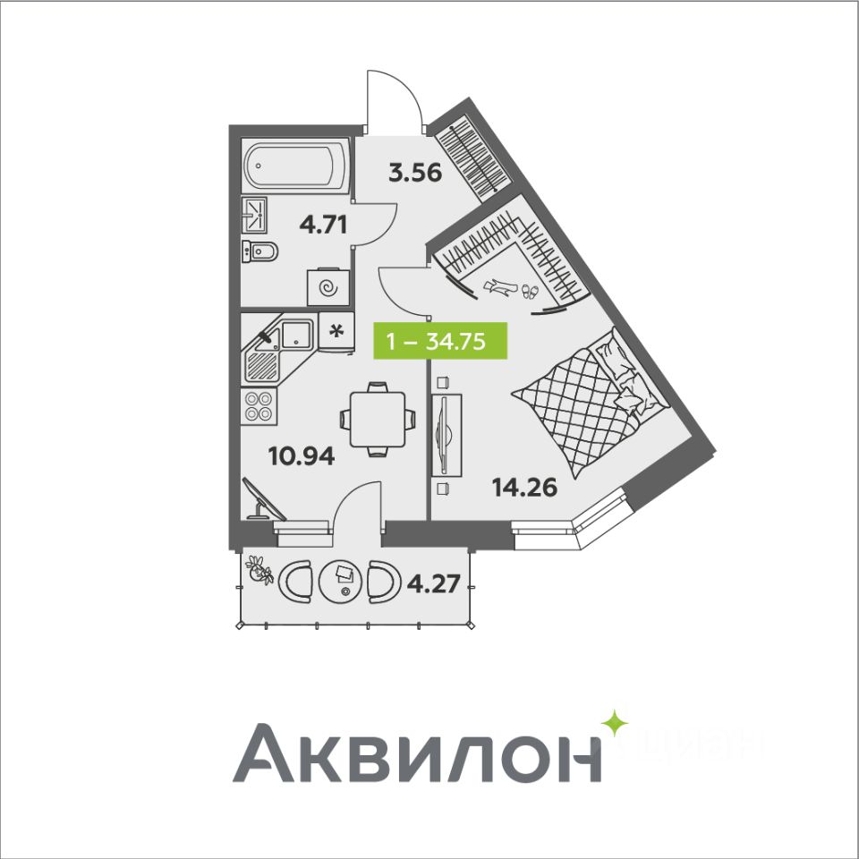 Общая площадь34,75 м²