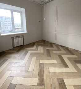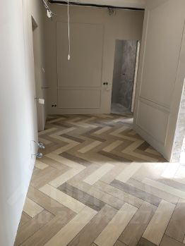 Теплые полы в кухне, прихожей и санузеле. В Кухне и прихожей положен керамогранит елочкой 4 цвета. В комнатах влагостойкая SPC плитка 43 класса стойкости ( при укладке использовано 3 цвета).