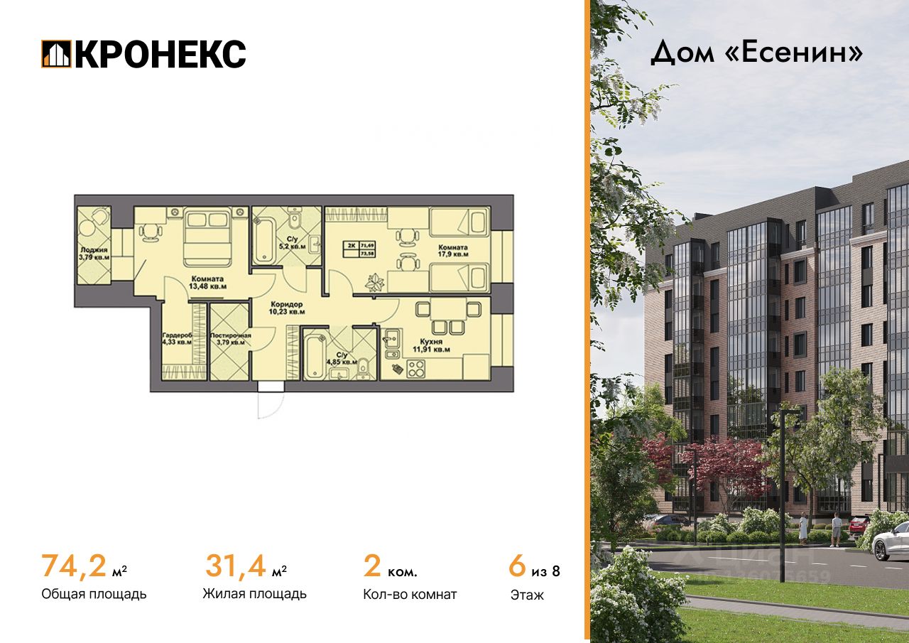 Продается 2-комн. кв-ра площадью 74.23 кв.м на 6 этаже 8 этажного кирпичного дома в Дом "Есенин" ГК Кронекс. Добро пожаловать в авторский дом "Есенин" новое слово в городском комфорте.