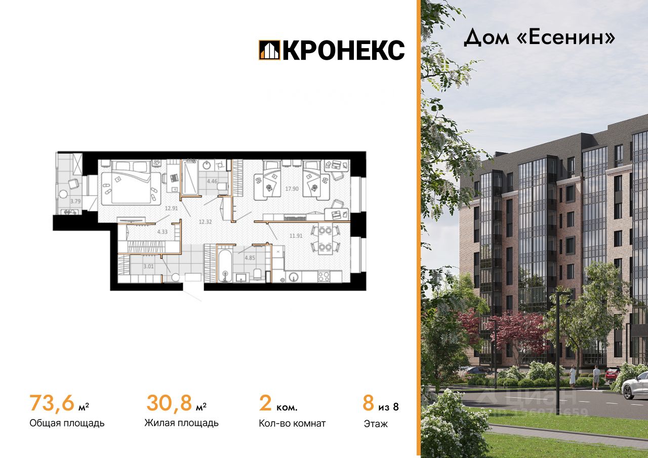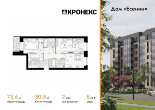 Продается 2-комн. кв-ра площадью 73.58 кв.м на 8 этаже 8 этажного кирпичного дома в Дом "Есенин" от ГК Кронекс. Добро пожаловать в авторский дом "Есенин" новое слово в городском комфорте.