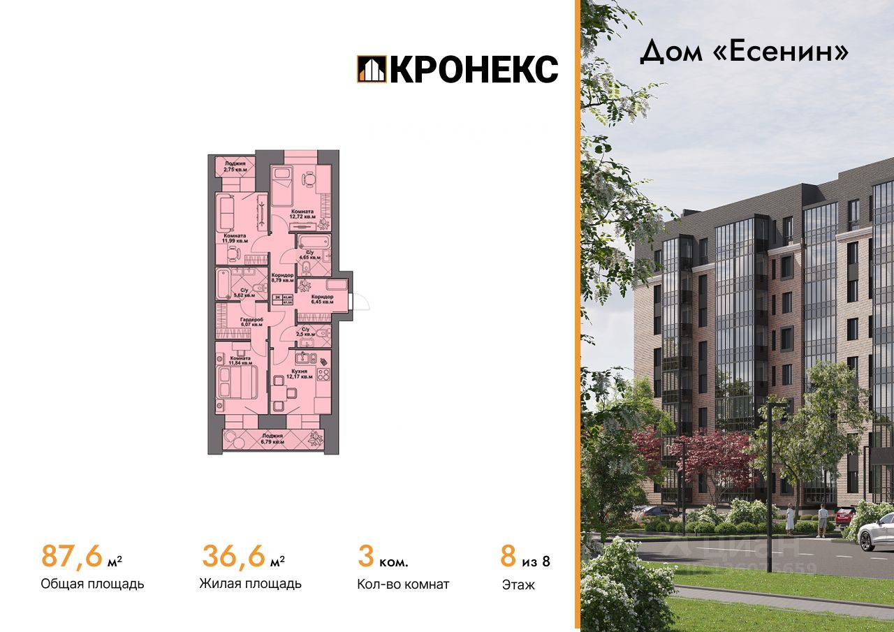 Продается 3-комн. кв-ра площадью 87.56 кв.м на 8 этаже 8 этажного кирпичного дома в Дом "Есенин" от ГК Кронекс. Добро пожаловать в авторский дом "Есенин" новое слово в городском комфорте.