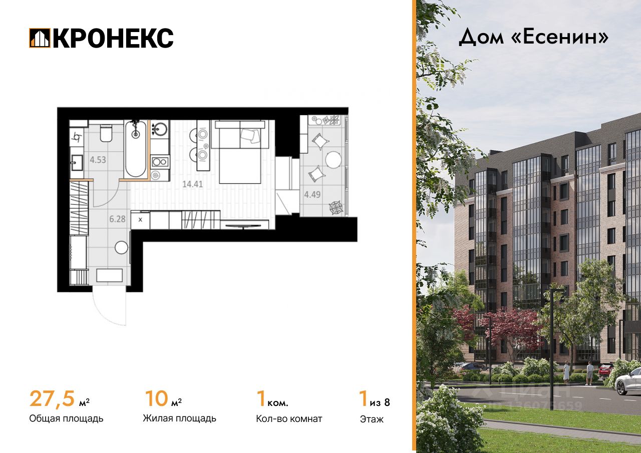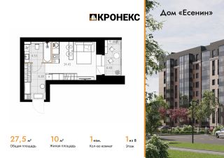Продается квартира-студия площадью 27.47 кв.м на 1 этаже 8 этажного кирпичного дома в Дом "Есенин" от ГК Кронекс. Добро пожаловать в авторский дом "Есенин" новое слово в городском комфорте.