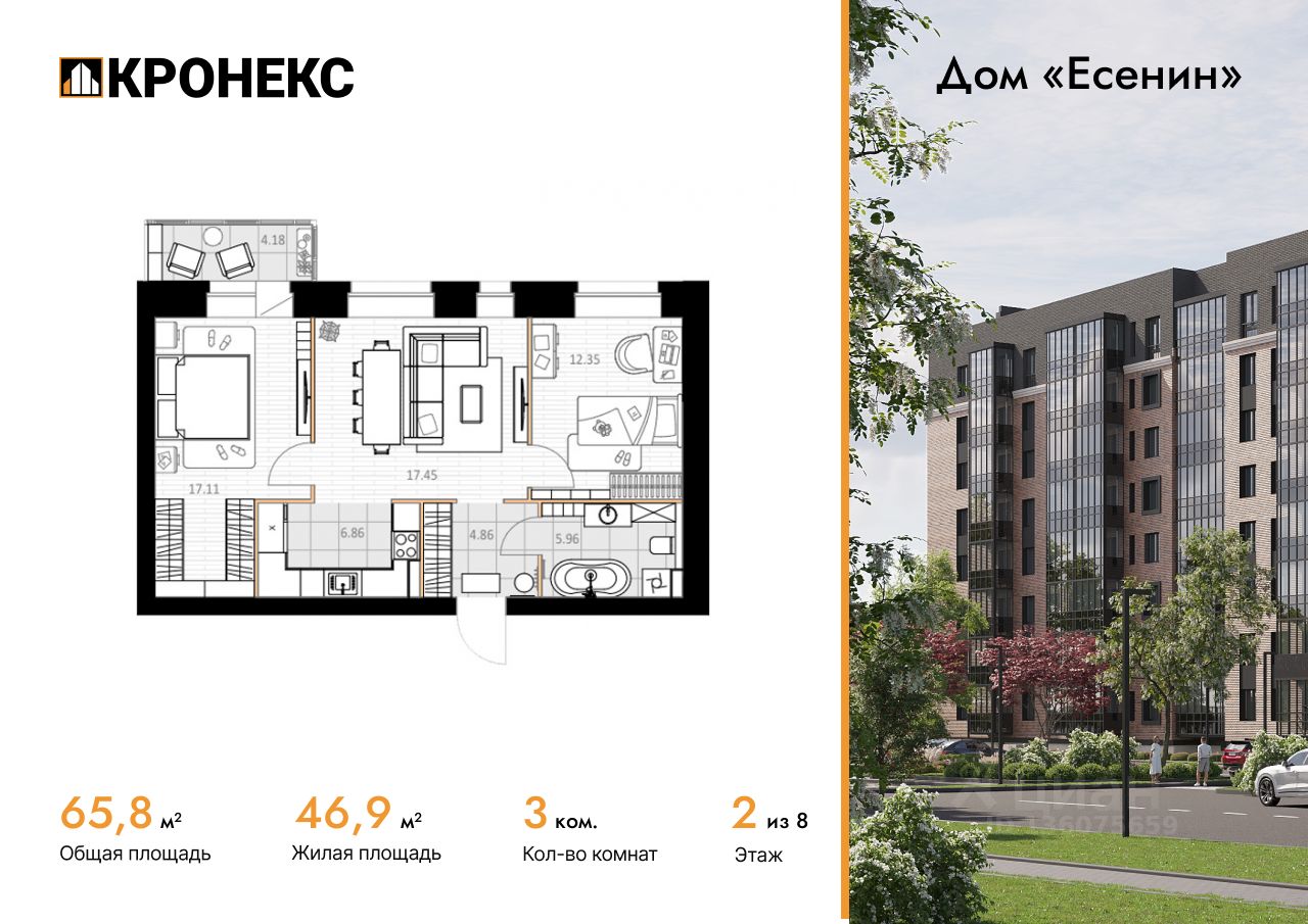 Продается 3-комн. кв-ра площадью 65.84 кв.м на 2 этаже 8 этажного кирпичного дома в Дом "Есенин" ГК Кронекс. Добро пожаловать в авторский дом "Есенин" новое слово в городском комфорте.