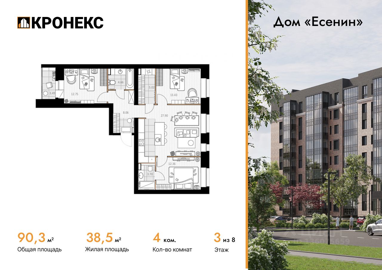 Продается 4-комн. кв-ра площадью 90.28 кв.м на 3 этаже 8 этажного кирпичного дома в Дом "Есенин" ГК Кронекс. Добро пожаловать в авторский дом "Есенин" новое слово в городском комфорте.