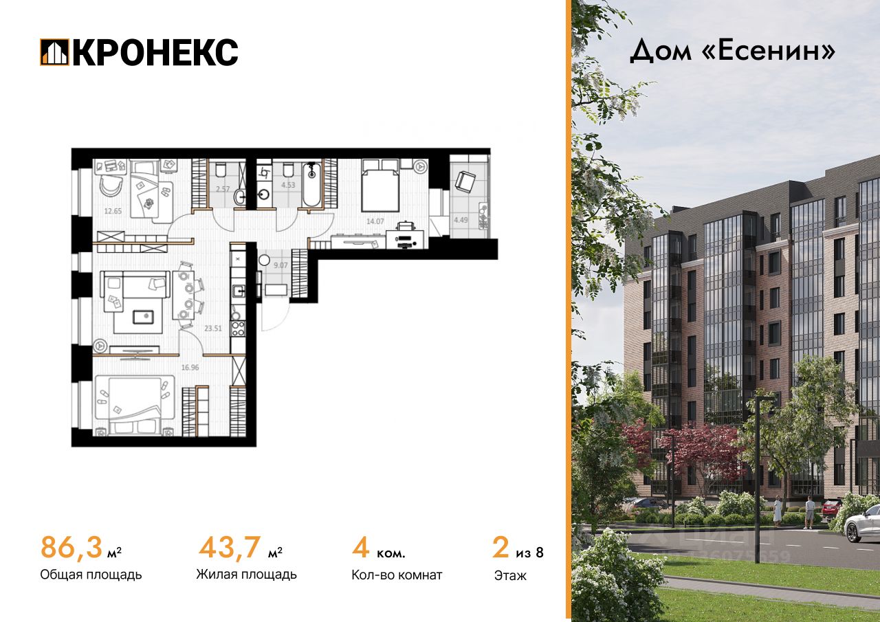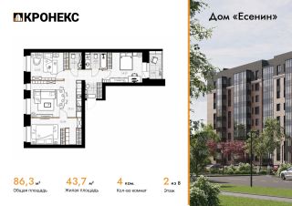 Продается 4-комн. кв-ра площадью 86.26 кв.м на 2 этаже 8 этажного кирпичного дома в Дом "Есенин" ГК Кронекс. Добро пожаловать в авторский дом "Есенин" новое слово в городском комфорте.