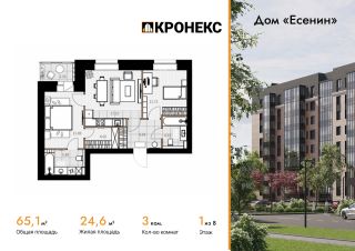 Продается 3-комн. кв-ра площадью 65.05 кв.м на 1 этаже 8 этажного кирпичного дома в Дом "Есенин" от ГК Кронекс. Добро пожаловать в авторский дом "Есенин" новое слово в городском комфорте.