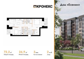 Продается 3-комн. кв-ра площадью 72.23 кв.м на 2 этаже 8 этажного кирпичного дома в Дом "Есенин" от ГК Кронекс. Добро пожаловать в авторский дом "Есенин" новое слово в городском комфорте.