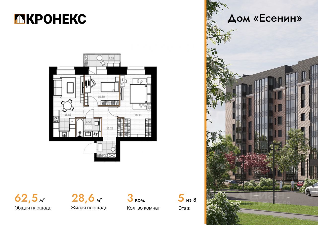 Продается 3-комн. кв-ра площадью 62.45 кв.м на 5 этаже 8 этажного кирпичного дома в Дом "Есенин" ГК Кронекс. Добро пожаловать в авторский дом "Есенин" новое слово в городском комфорте.