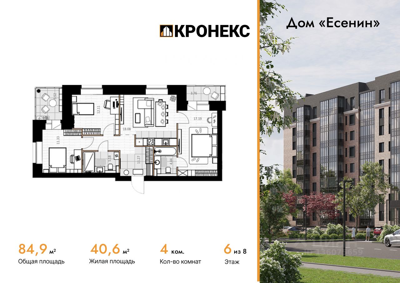 Продается 4-комн. кв-ра площадью 84.89 кв.м на 6 этаже 8 этажного кирпичного дома в Дом "Есенин" от ГК Кронекс. Добро пожаловать в авторский дом "Есенин" новое слово в городском комфорте.
