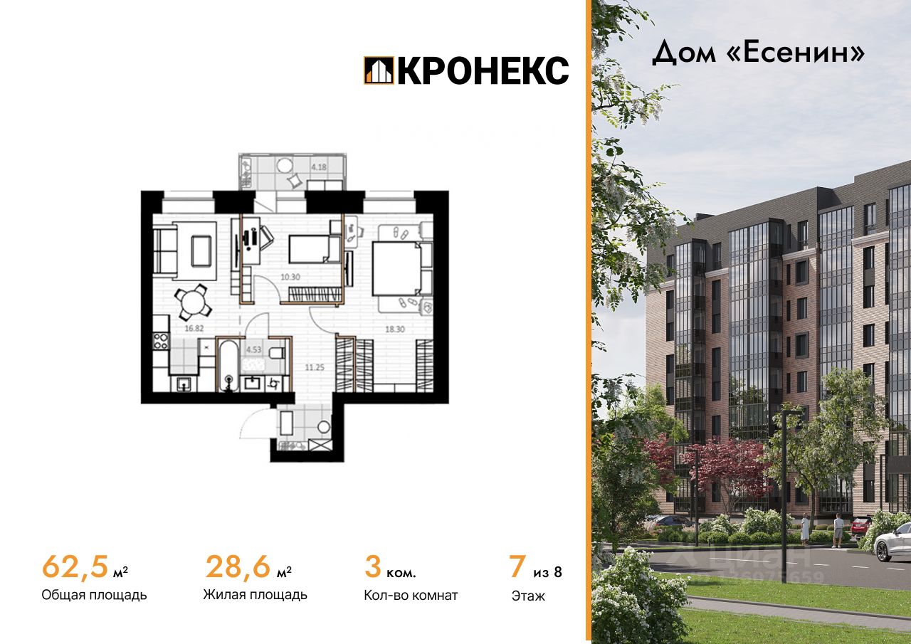 Продается 3-комн. кв-ра площадью 62.45 кв.м на 7 этаже 8 этажного кирпичного дома в Дом "Есенин" от ГК Кронекс. Добро пожаловать в авторский дом "Есенин" новое слово в городском комфорте.