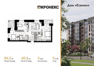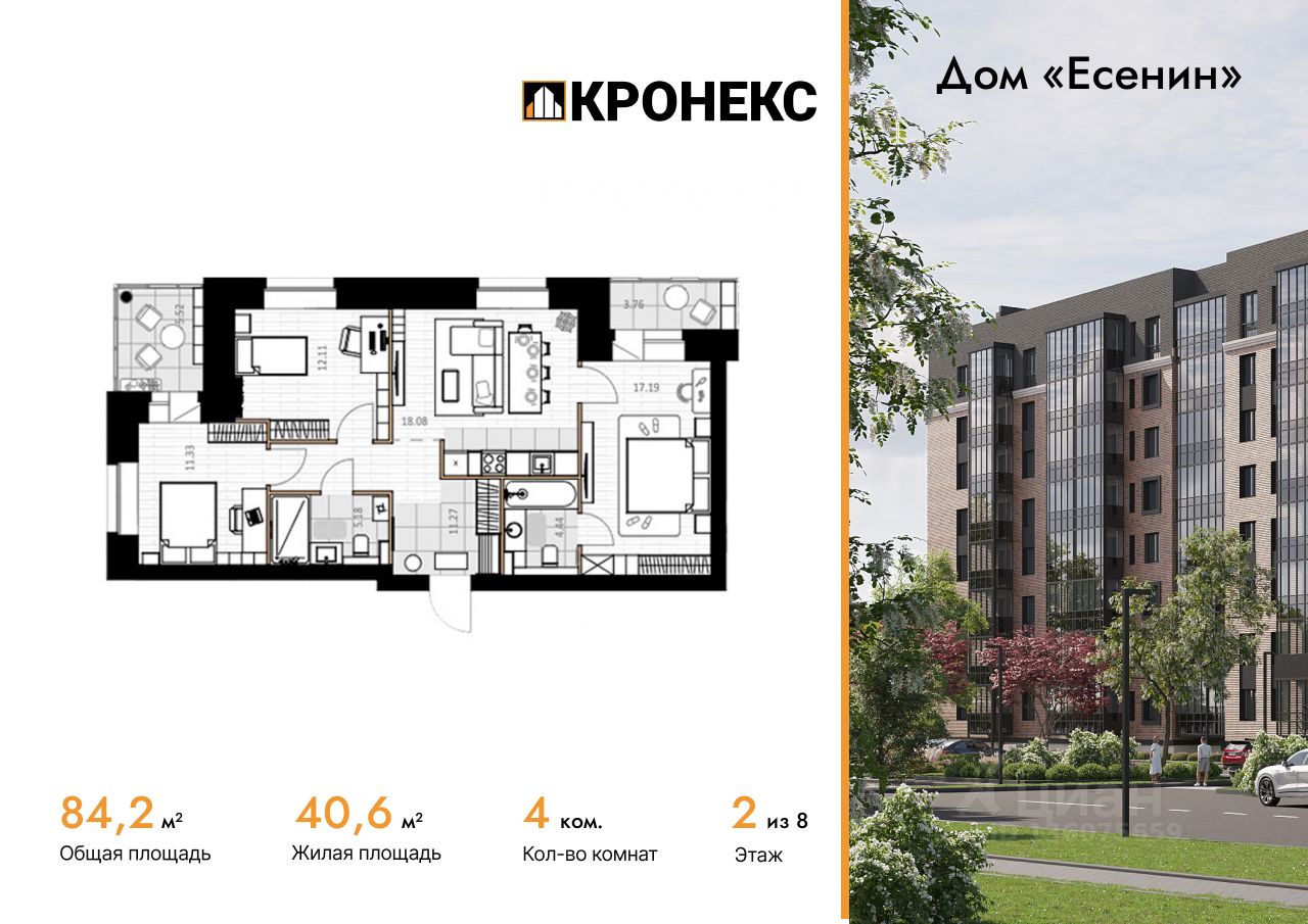 Продается 4-комн. кв-ра площадью 84.24 кв.м на 8 этаже 8 этажного кирпичного дома в Дом "Есенин" от ГК Кронекс. Добро пожаловать в авторский дом "Есенин" новое слово в городском комфорте.