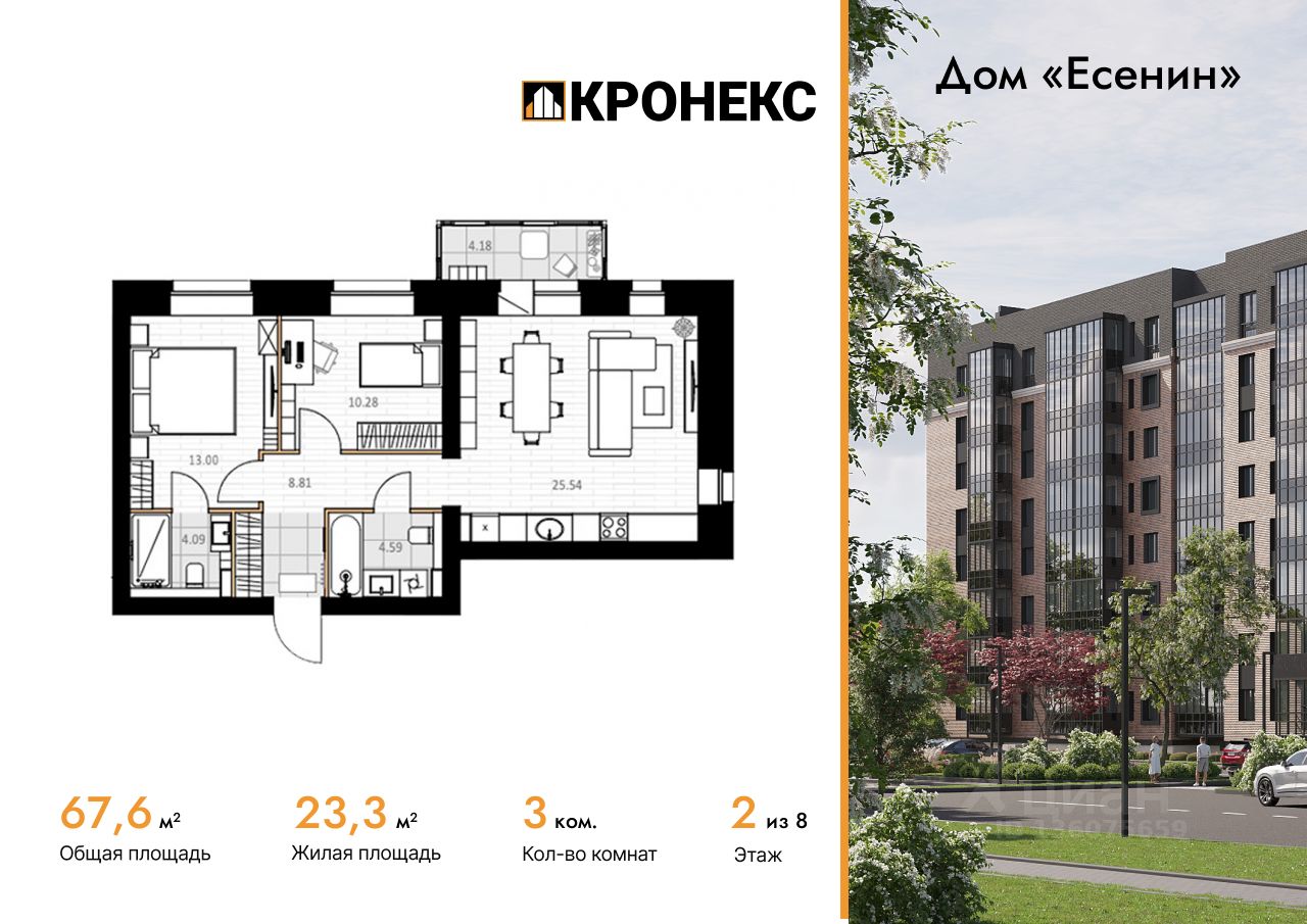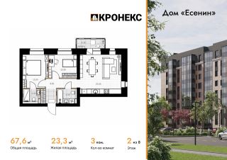 Продается 3-комн. кв-ра площадью 67.56 кв.м на 2 этаже 8 этажного кирпичного дома в Дом "Есенин" от ГК Кронекс. Добро пожаловать в авторский дом "Есенин" новое слово в городском комфорте.
