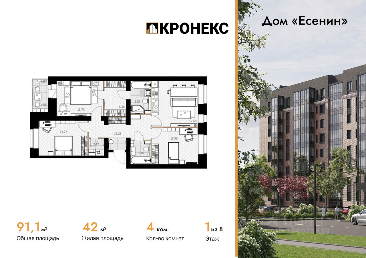 Продается 4-комн. кв-ра площадью 91.11 кв.м на 6 этаже 8 этажного кирпичного дома в Дом "Есенин" от ГК Кронекс. Добро пожаловать в авторский дом "Есенин" новое слово в городском комфорте.