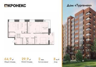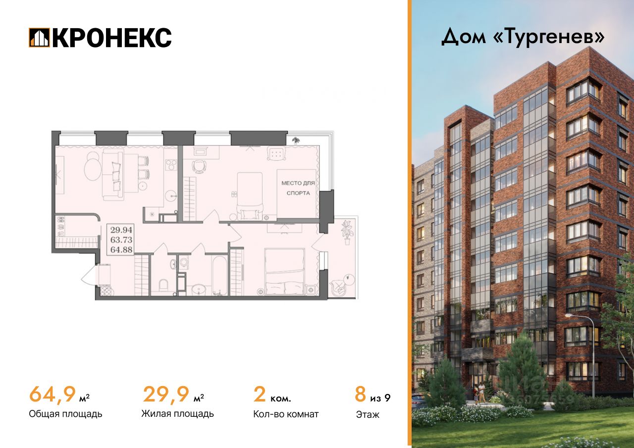 Продается 2-комн. кв-ра площадью 64.88 кв.м на 8 этаже 9 этажного монолитно-кирпичного дома в Дом "Тургенев" ГК Кронекс. Свежий воздух и живописные виды каждый день!
