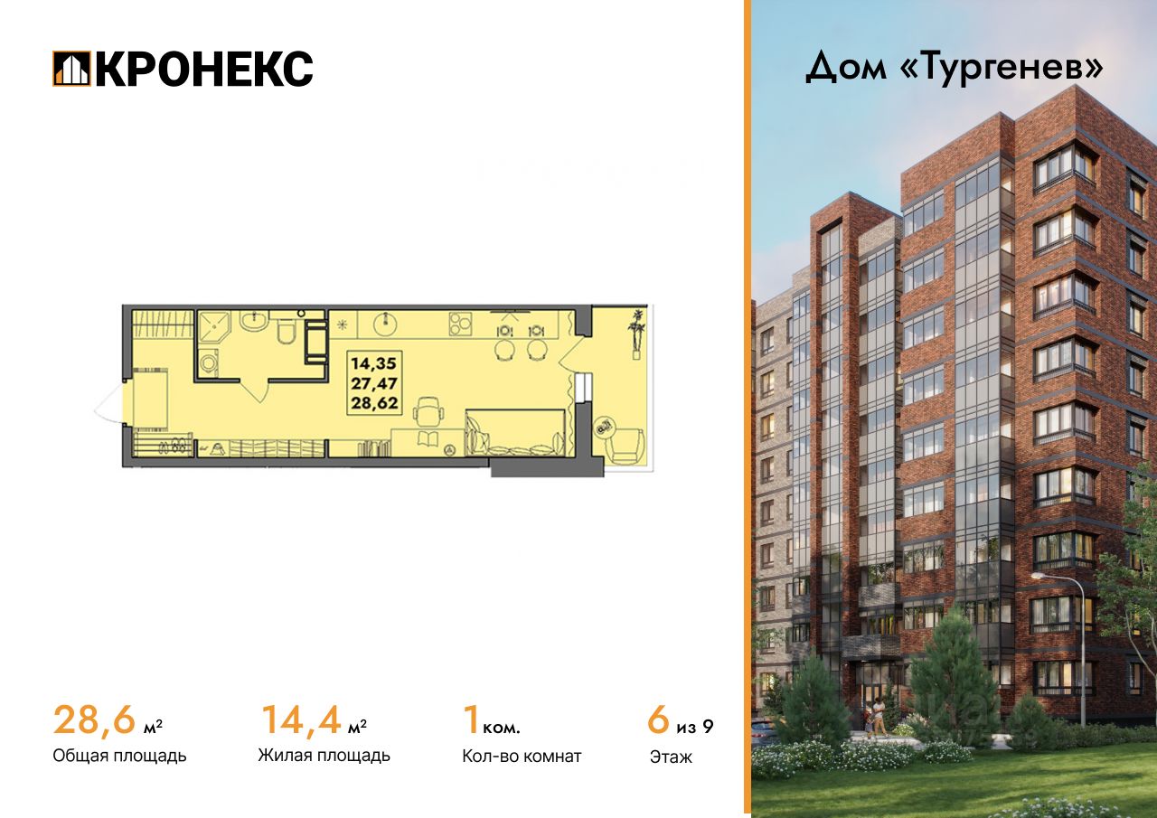 Продается квартира-студия площадью 28.62 кв.м на 6 этаже 9 этажного монолитно-кирпичного дома в Дом "Тургенев" от ГК Кронекс. Свежий воздух и живописные виды каждый день!