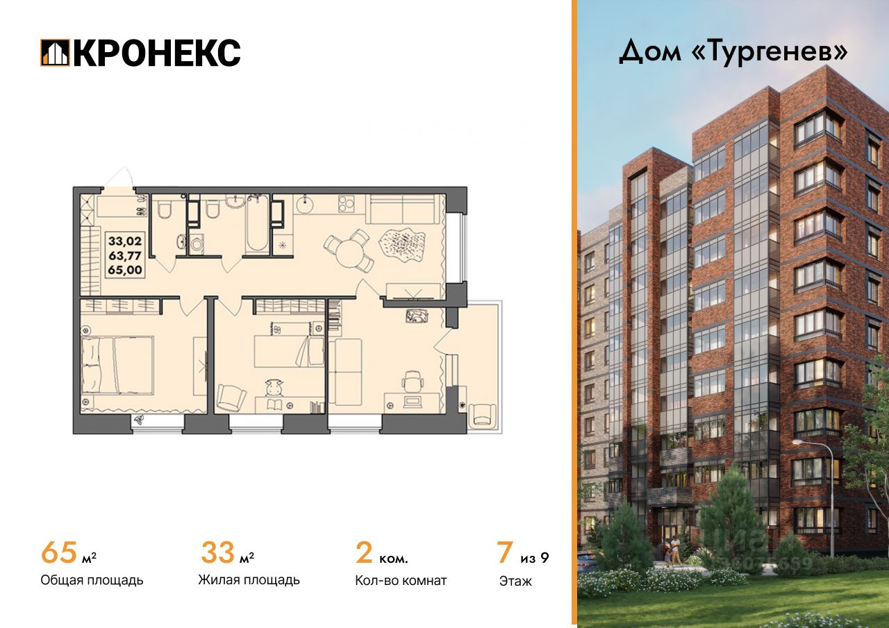 Продается 2-комн. кв-ра площадью 65 кв.м на 7 этаже 9 этажного монолитно-кирпичного дома в Дом "Тургенев" ГК Кронекс. Свежий воздух и живописные виды каждый день!