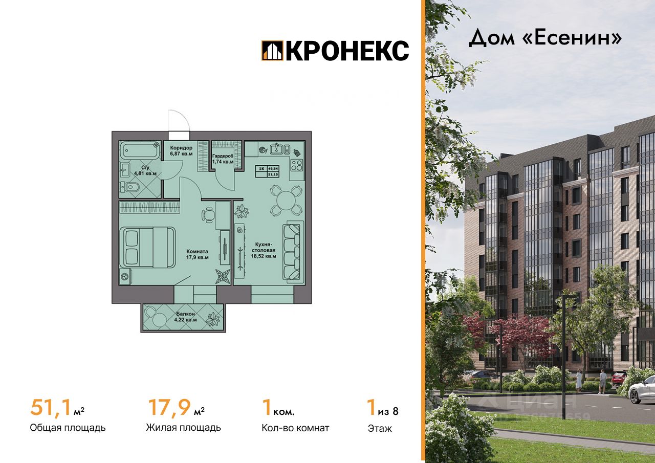 Продается 1-комн. кв-ра площадью 51.1 кв.м на 1 этаже 8 этажного кирпичного дома в Дом "Есенин" от ГК Кронекс. Добро пожаловать в авторский дом "Есенин" новое слово в городском комфорте.