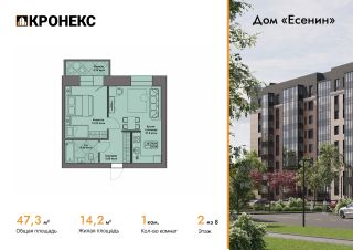 Продается 1-комн. кв-ра площадью 47.33 кв.м на 2 этаже 8 этажного кирпичного дома в Дом "Есенин" ГК Кронекс. Добро пожаловать в авторский дом "Есенин" новое слово в городском комфорте.