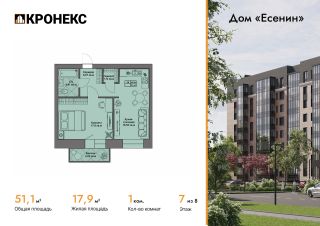 Продается 1-комн. кв-ра площадью 51.1 кв.м на 7 этаже 8 этажного кирпичного дома в Дом "Есенин" ГК Кронекс. Добро пожаловать в авторский дом "Есенин" новое слово в городском комфорте.