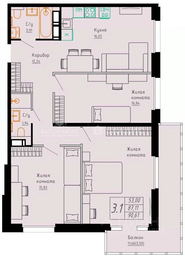 Квартира расположена на 3 этаже 11-этажного дома, имеет общую площадь 90,61 кв.м, из которых 53 кв. м занимает жилая площадь (3 просторных комнаты площадью 16,02, 15,83 и 20,33 кв.м), а 16,02 кв. м отведено под кухню. Все комнаты раздельные. Высокие потолки — 2,7 метра. Большие окна выходят во двор в сторону ул.Чумбарова-Лучинского и ул.Иоанна Кронштадтского. Квартира угловая, с огромным балконом с панорамным остеклением. Квартира сдается в черновой отделке, что позволяет сразу приступить к финишной отделке помещения по своему вкусу. Чистовую можно заказать прямо у застройщика.