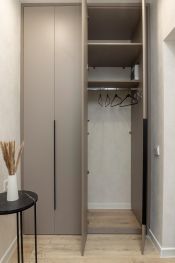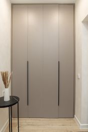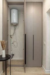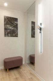 В прихожей установлен шкаф в потолок, новая дверь с шумоизоляцией, большое зеркало с декоративной подсветкой, банкетка. В нем же находится водонагреватель, эл. щиток, предусмотрено место для стиральной машинки.