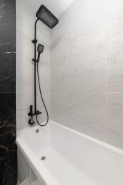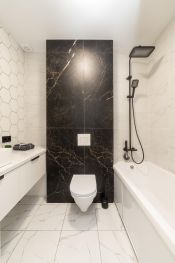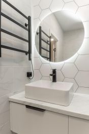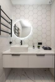 Санузел в кафеле, с удобной полкой под мойкой с выдвижными ящиками для хранения полотенец, химии для уборки или косметики. Электрический полотенцесушитель, тропический душ, унитаз-инсталляция.
