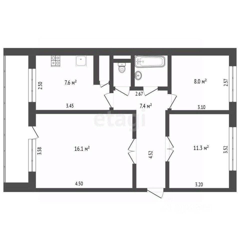 Общая площадь распределена между тремя жилыми комнатами (16,1 м², 11,3 м², 8,0 м²) с ориентацией на разные стороны света.