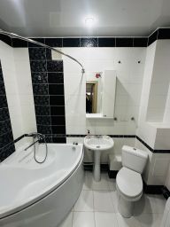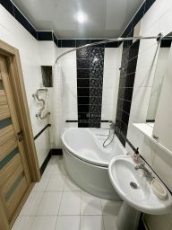 -Просторный сан. узел в кафеле, установлены счетчики, есть выводы под бойлер.