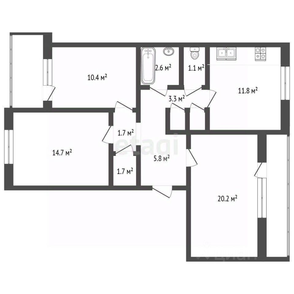 73,4 кв.м. с раздельными комнатами: 20,2 + 14,7 + 10,4 кв.м. — идеально для Вашей семьи.